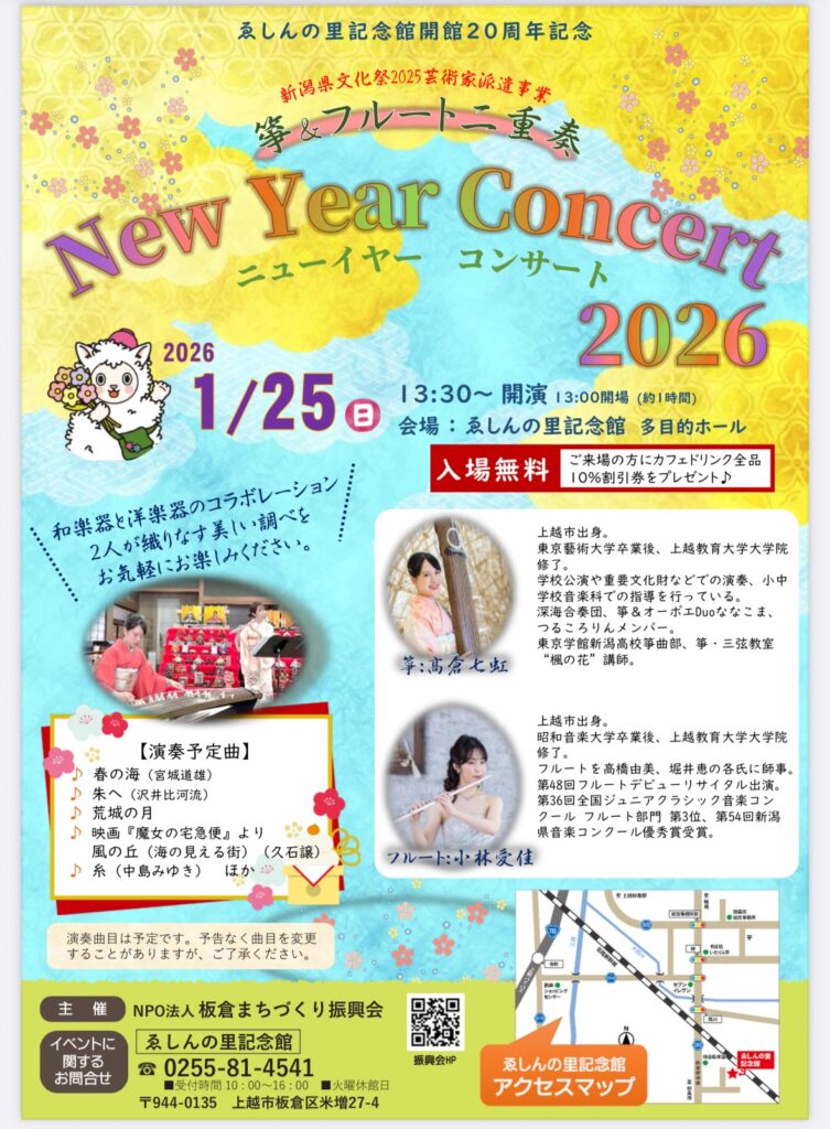 上越市板倉区ゑしんの里にて、「開館20周年記念ニューイヤーコンサート2026」(新潟県文化祭2025芸術家派遣事業)に出演しました。